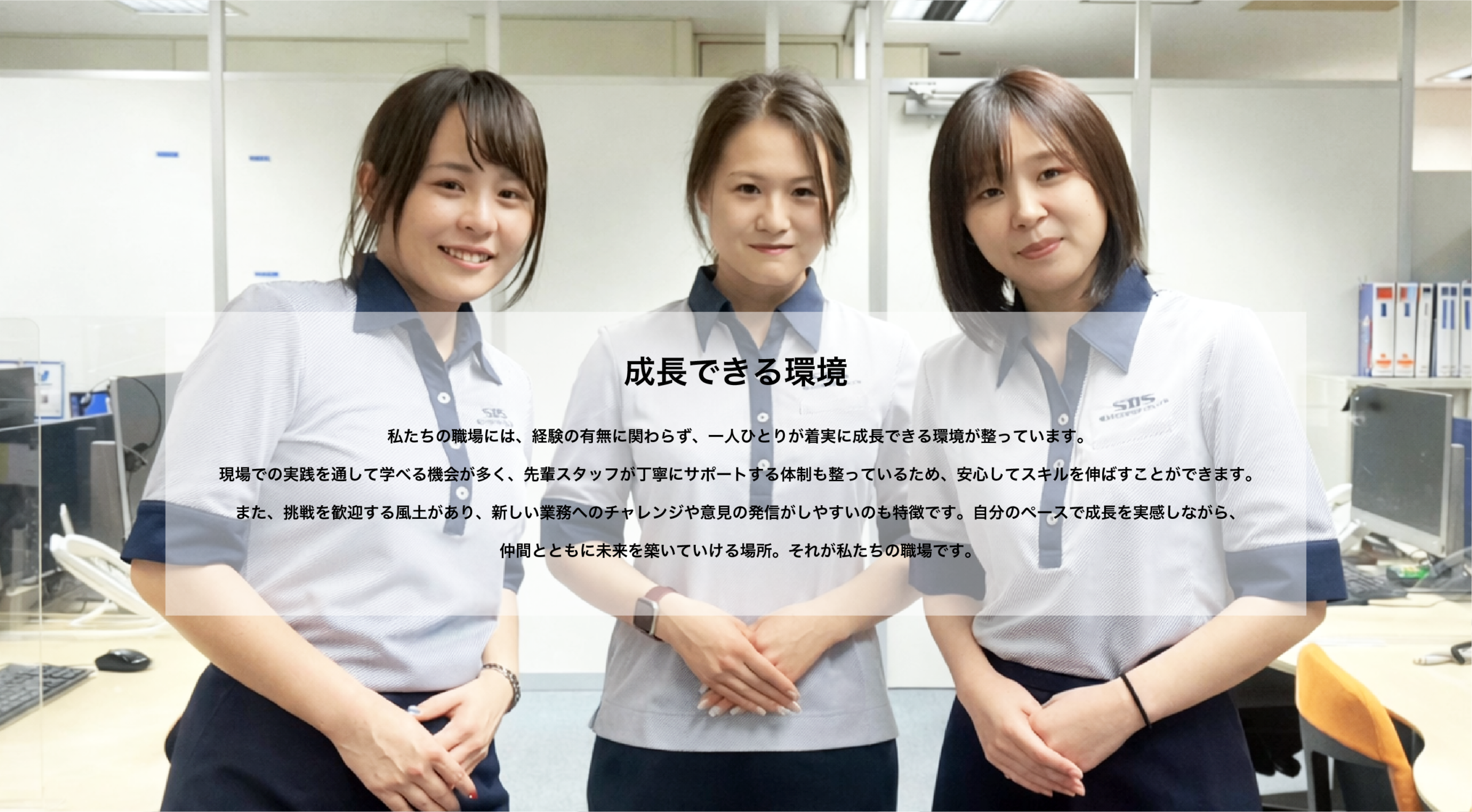 私たちは、日々のコミュニケーションを大切にしながら、お互いに支えあって仕事を進めています。困った時にすぐに相談できる環境があるため、安心して業務に取り組めるのが特徴です。また入社後は基礎からしっかり学べる研修を用意していますので、未経験の方でも安心してスタートできます。「安心して長く働ける環境で成長したい」そんな方と一緒に働けることを楽しみにしています。